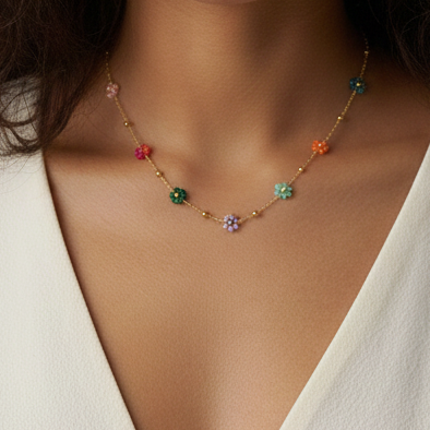 A delicate gold-toned chain adorned with tiny pastel floral beads, inspired by fresh garden blooms. Light, playful, and perfect for adding a soft pop of colour to everyday looks or layered styles.