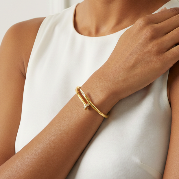 A bold yet elegant statement bracelet inspired by modern design, finished in radiant 18K gold. Minimal, powerful, and perfect for everyday wear.