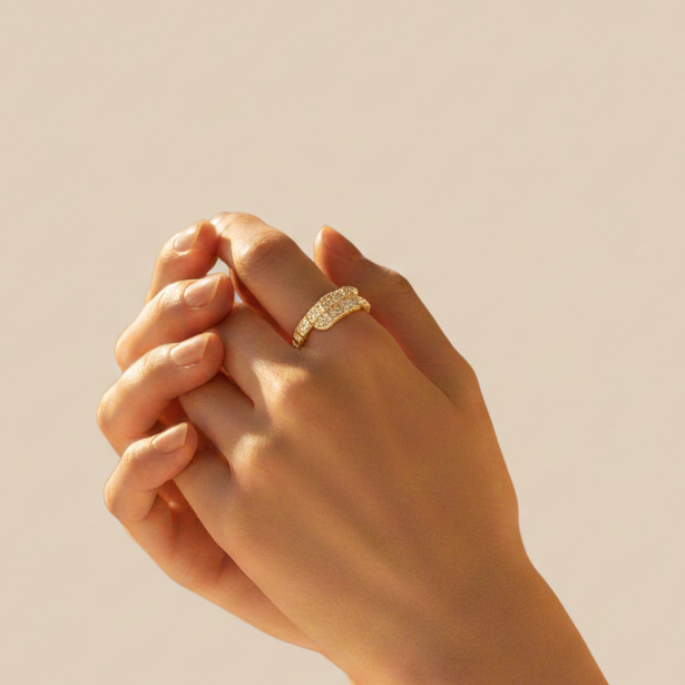 Elegant 18K gold-plated open ring featuring geometric pavé-set crystal detailing for a modern, luxe look. Adjustable, lightweight, and anti-tarnish—perfect for everyday wear or statement styling.
